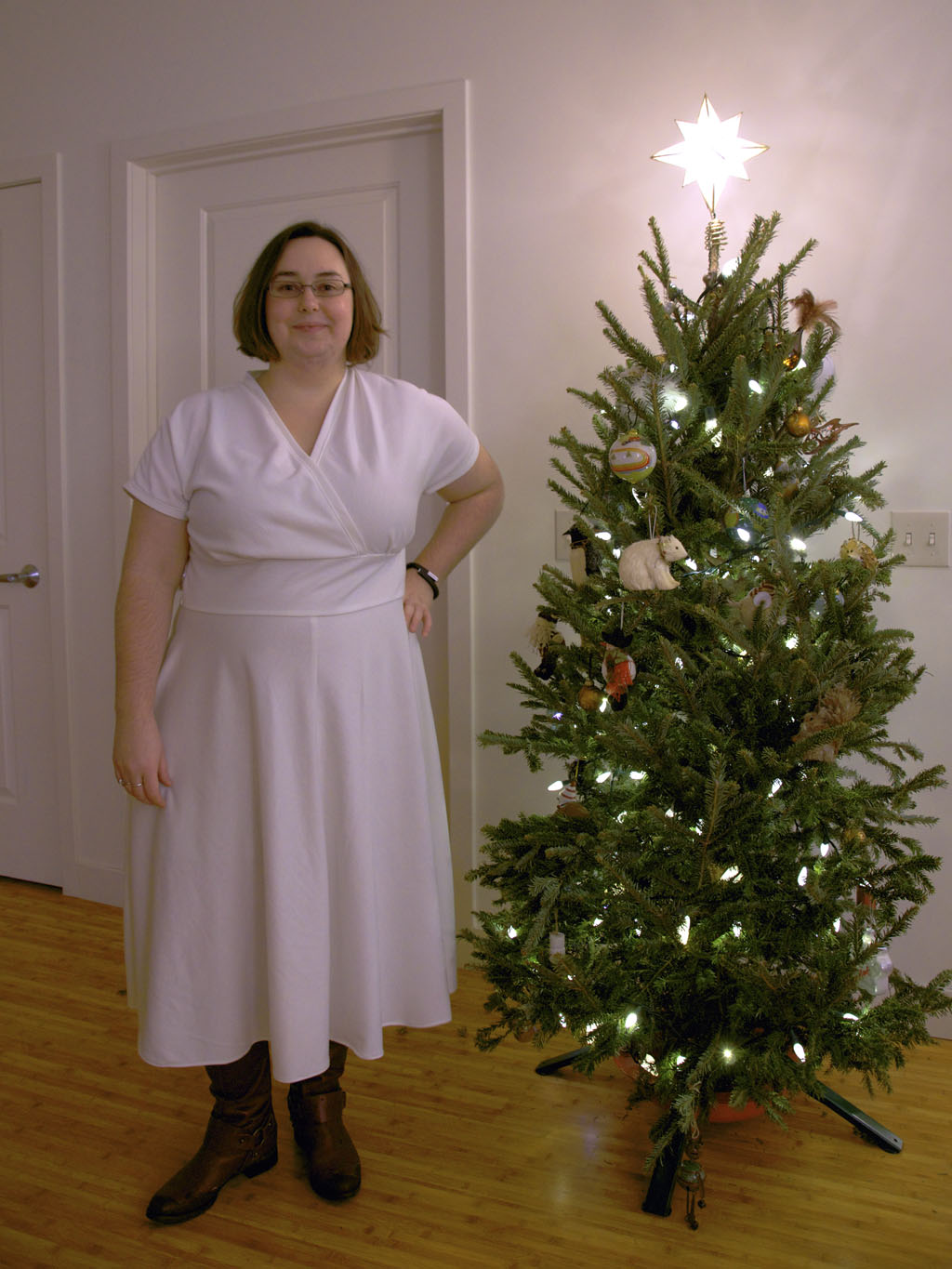 When my company subtitled the holiday party theme āwear white,ā I decided it was the perfect opportunity to pick up where I left off and whip together a wearable muslin (since white doesn’t stay that way for long when I wear it). Because I had two attempts at fitting the bodice under my belt from the spring, it went together quickly, and fits pretty well. The only additional modification I made was shortening the midriff section (perhaps too much) because I didn’t like where it hit on my body in the previous iteration.