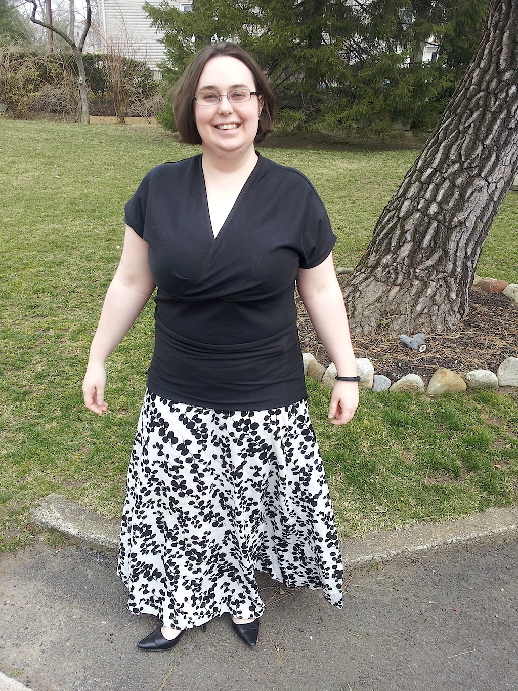 My project last week was to cut out and assemble a shirt based on the dress pattern Tiramisu from Cake Patterns. Why a shirt rather than the dress? I wasnāt in love with the fabric I had (a basic black medium-weight jersey from JoAnn Fabrics), and wanted to get the fit issues out of the way before cutting out a skirt. Mostly, I donāt need another crossover bodice black dress.
