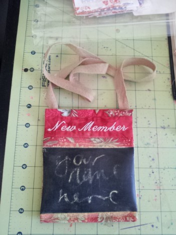 The quilt club is transitioning to having members make their own name tags this year. So, in order to give new members a bit of a grace period while still allowing them to have something with their name on it, I am making up a few new member name tags to lend out at meetings. At first, I was just going to make a window into which we could slip a bit of paper with their name on it, but then my imagination got away from me and I decided to try out Chalk Cloth.