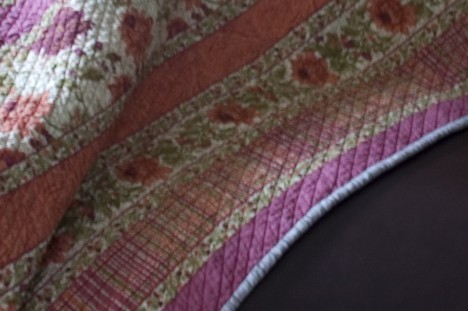 Carl picked the fabrics out with a bit of guidance from me. At first, I wasn’t sure about the grey striped binding with the warm cream background of the quilt fabric, but the more I looked at it, the more it grew on me. The photos don’t show it well, but it has a small pink stripe in there, and it ties in pretty well.