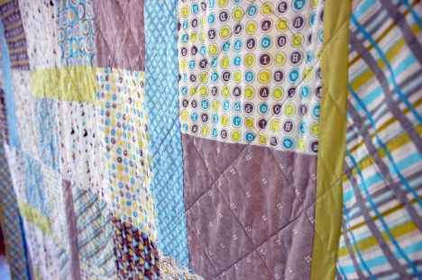 I may have forgotten about needing binding fabric when piecing the back, requiring a last minute run to the store for more of the dark blue. I couldn’t get my hands on any Clover quickly, so that part of the binding is pieced with scraps of one of the top fabrics. I wanted to echo the inner border’s dual color for the binding to tie it all together. Two corners are mitered, but the other two wrap around to echo the log-cabin piecing of the inner border.